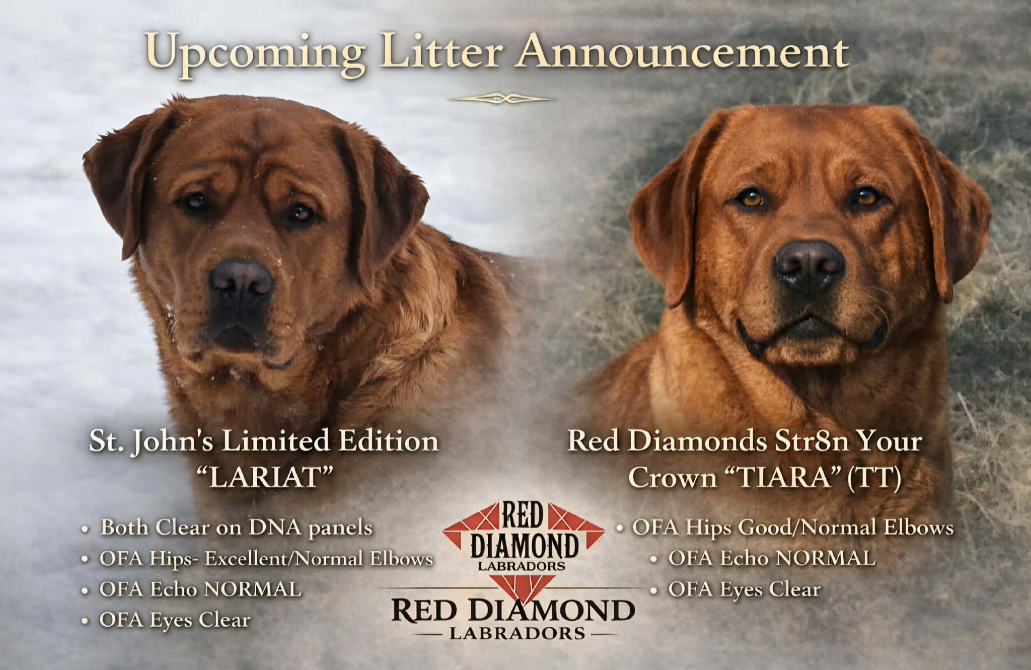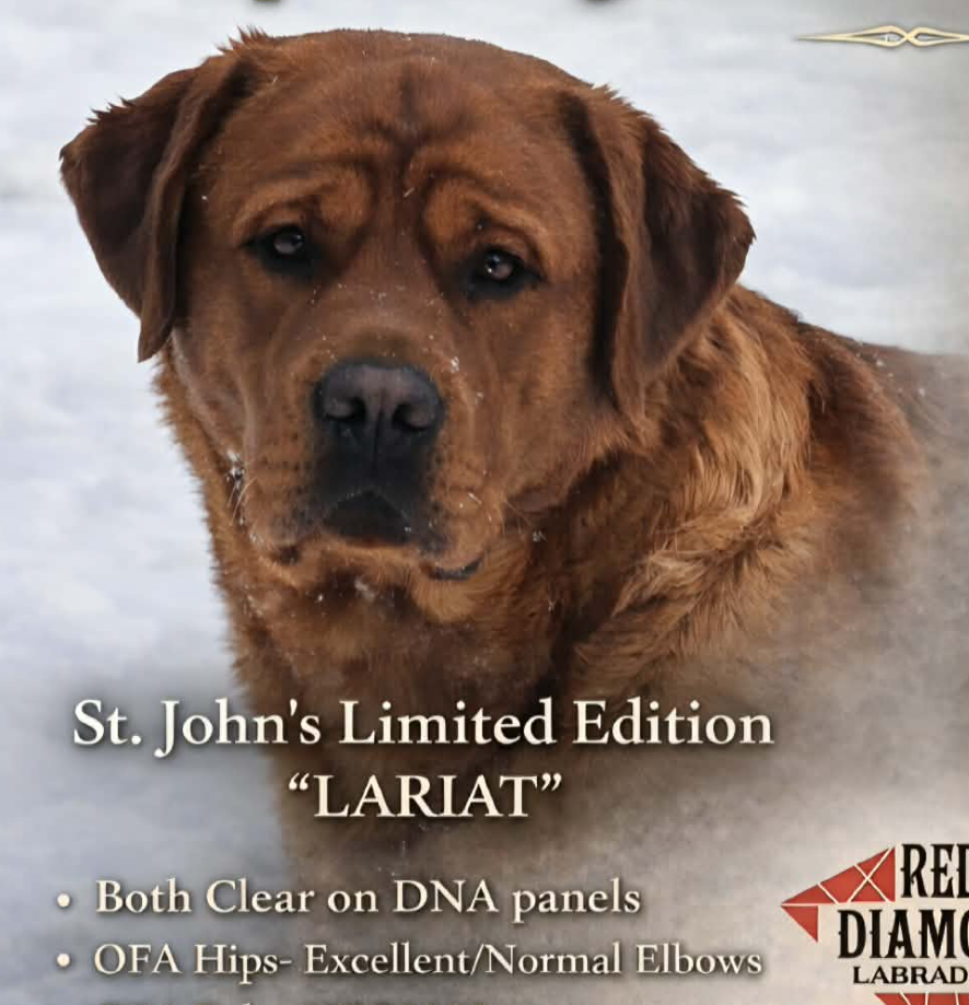 Red Diamonds Str8n Your Crown (Tiara – “TT”) A strong yet feminine fox red female with presence, balance, and a beautiful Labrador outline. Tiara represents our commitment to preserving true Labrador type, not just color. St. John’s Limited Edition “LARIAT” Lariat is a powerful, well-balanced fox red male with an exceptional headpiece, correct movement, and substance without heaviness. He is a standout example of structure, soundness, and breed type.